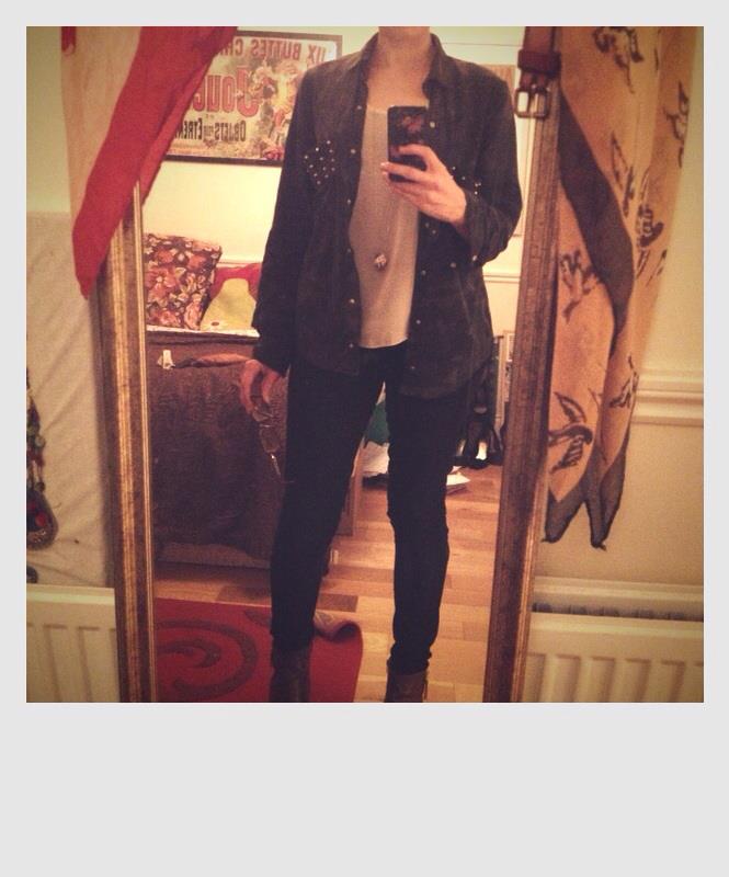 I got it a little big so that I can wear it as a "jacket" over jeans and a t-shirt, like I have done today. It is equally great over dresses in the same jacket-y guise, especially when you want to dress them down a bit. Or I can button it and wear it as a modern take on a button down with jeans or a skirt (tucked in, left out, sloppy tucked, sleeves rolled, etc, etc I could go on and on). The green is a neutral and the studs and gold accents make a regular casual-leaning shirt more interesting, modern and dressier so it would be fab with jeans and heels for a night out, although I've yet to actually do that, I must (watch this space)! It looks great against dark or light solids and is the perfect element for pattern mixing, and it's just right when you're travelling or don't know what to wear; you can just throw on and it basically makes an outfit instantly.